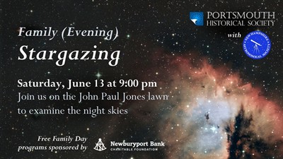 Join the Portsmouth Historical Society and the New Hampshire Astronomical Society for a night of stargazing on the lawn on the John Paul Jones House. Try out telescopes from Astronomical Society volunteers, take a closer look at the Portsmouth skies, and imagine how it felt for people throughout time to look up at those same stars! All ages welcome!